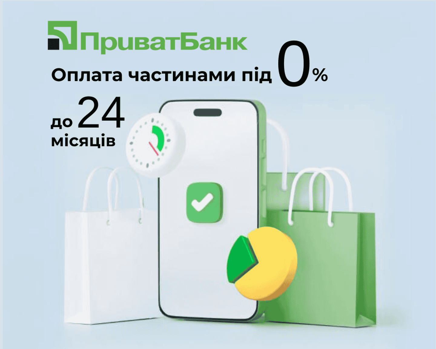 ![]() | Покупка частинами від ПриватбанкуОтримайте карту Приватбанк у відділенні або в додатку Приват24 і дізнайтеся свій ліміт (для отримання карти перейдіть на сайт privatbank.ua).