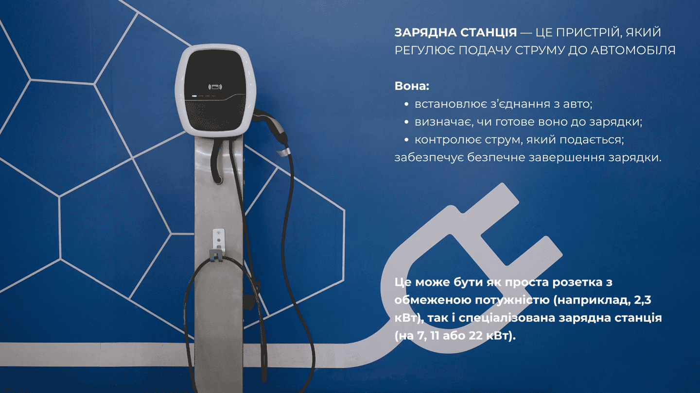 Зарядка електромобіля — це процес передавання електричної енергії з зовнішнього джерела до акумуляторної батареї транспортного засобу. В основі цього процесу лежить контрольований електричний обмін між мережею живлення (або генератором, як-от сонячна станція) та електромобілем.
