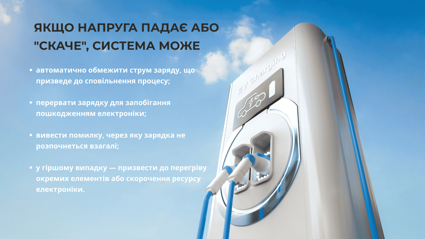 Зарядні станції для електромобілів мають високу чутливість до напруги в електромережі, оскільки для їхньої стабільної роботи потрібне якісне, безперебійне живлення у чітко визначених межах. Більшість моделей, призначених для використання в побутових умовах, розраховані на номінальну напругу 230 В із допустимим відхиленням ±10%. Тобто критичні межі роботи — від 207 до 253 В. Вихід за ці межі майже завжди призводить до збоїв, відключень або повної зупинки зарядного процесу.