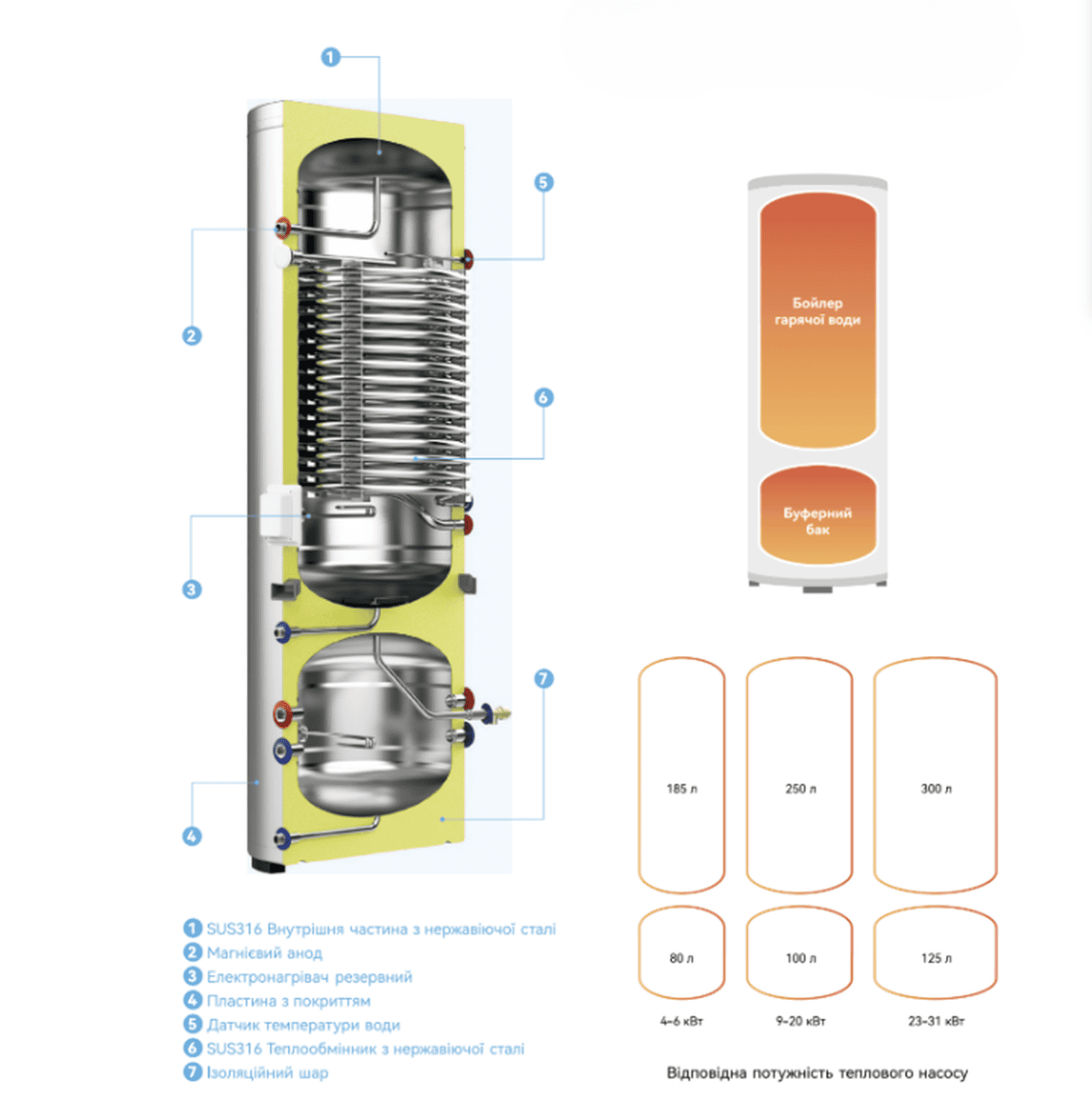 - буферну ємність об’ємом 110 літрів для накопичення тепла з теплового насоса або інших джерел.