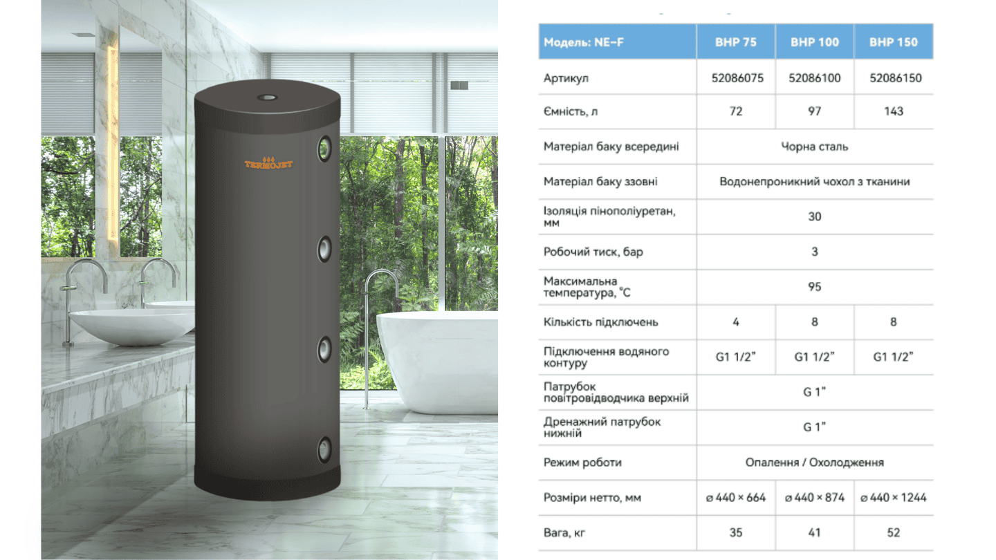 Бак-накопичувач Termojet БТН 100 — буферна ємність об’ємом 97 літри, призначена для накопичення та раціонального розподілу теплової енергії в системах опалення й охолодження.