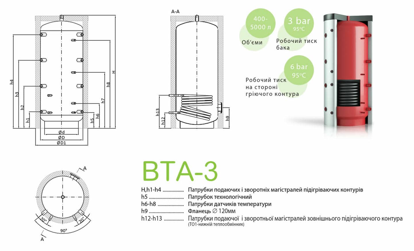 Головною відмінністю моделі ВТА-3 є вбудований теплообмінник, який розташований у нижній частині бака. Він призначений для роботи із сонячними колекторами та іншими низькотемпературними джерелами тепла. Завдяки цьому ви зможете максимально ефективно використовувати відновлювану енергію та суттєво знизити витрати на опалення.