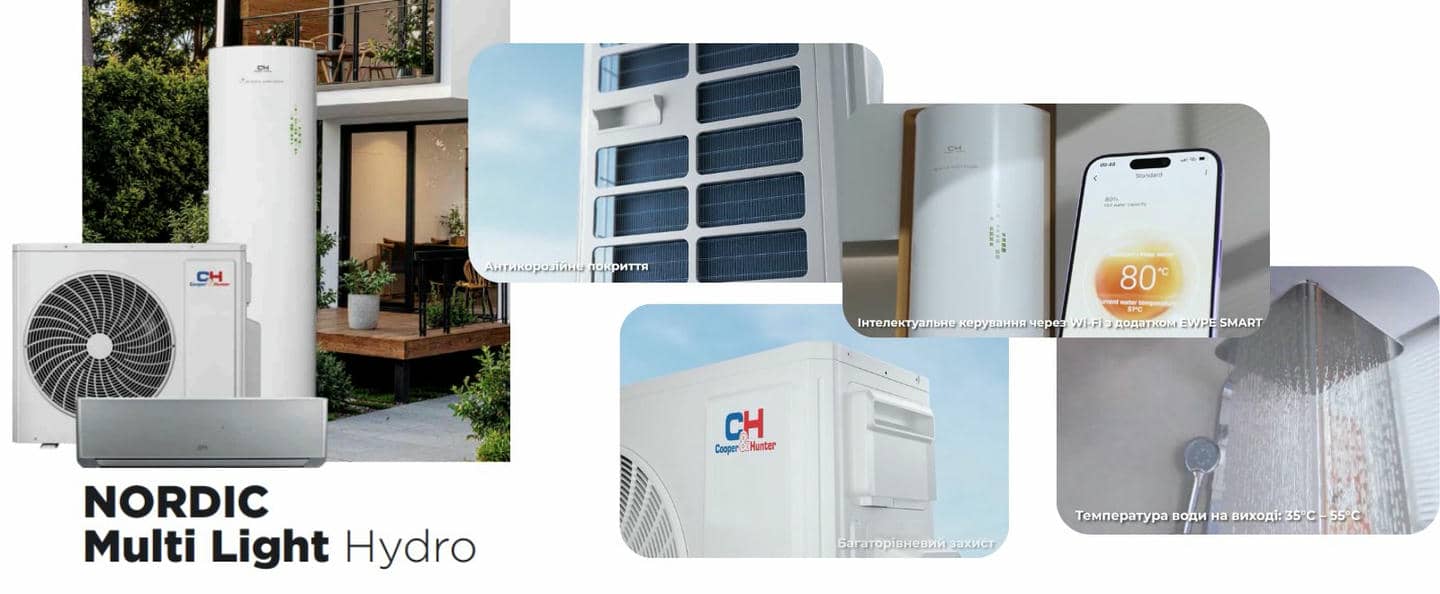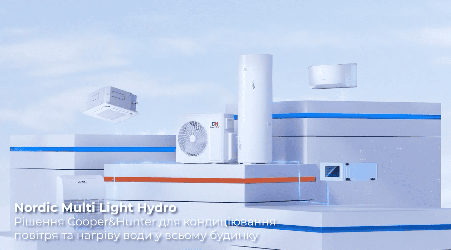 Система Nordic Multi Light Hydro — це інноваційне та енергоефективне гібридне рішення від Cooper&Hunter, яке поєднує звичну мультиспліт-функціональність із можливістю підключення бойлера гарячої води. Завдяки цій інтеграції, одна система може охолоджувати, обігрівати та нагрівати воду одночасно, забезпечуючи максимальний комфорт у будь-яку пору року.