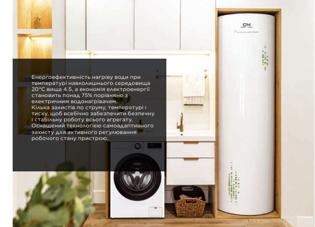 При температурі +20 °C система демонструє COP на рівні 4.5 або вище при прогріванні води, що виводить її у клас надвисокої енергоефективності. Порівняно з електричним водонагрівачем, економія споживаної електроенергії становить понад 75%.