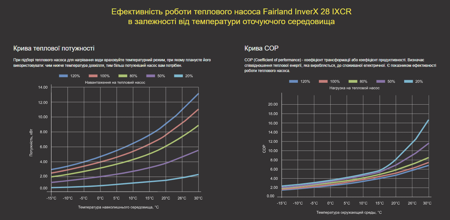 Режим Turbo: Теплопродуктивність: 120%. Цей режим призначений для швидкого нагріву води. Під час активації цього режиму насоси серії InverX виробляють додаткову енергію на 20%, забезпечуючи більш швидке нагрівання. При цьому насоси залишаються на рівні набагато тихішим, ніж звичайні інверторні насоси, і мають вищий коефіцієнт продуктивності (COP).
