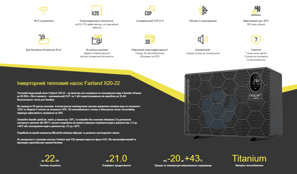 ПРИЗНАЧЕННЯ: Тепловий насос Fairland X20-22 для басейну