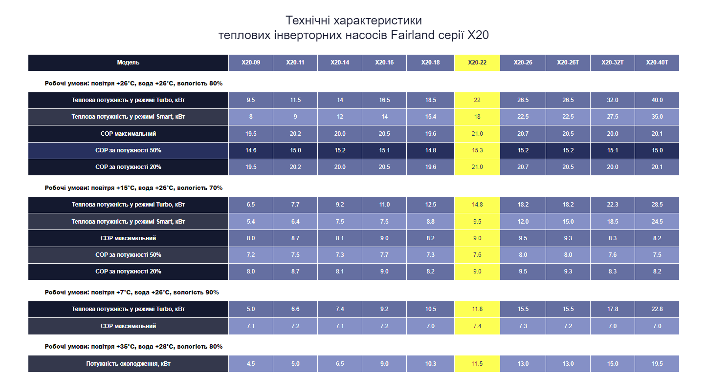 Fairland X20-22 — це тепловий інверторний насос, який встановлює нові стандарти в галузі нагрівання та охолодження води в басейнах. Він являє собою ідеальне рішення для басейнів об’ємом до 95 м³, забезпечуючи оптимальну температуру води в будь-який час року. Інверторна технологія та високоефективний компресор Mitsubishi  забезпечують високу ефективність на 50-70% вищу, ніж у стандартних інверторних системах. Завдяки вбудованій системі управління, насос легко налаштовується і контролюється в трьох різних режимах роботи: Turbo, Smart і Silence.