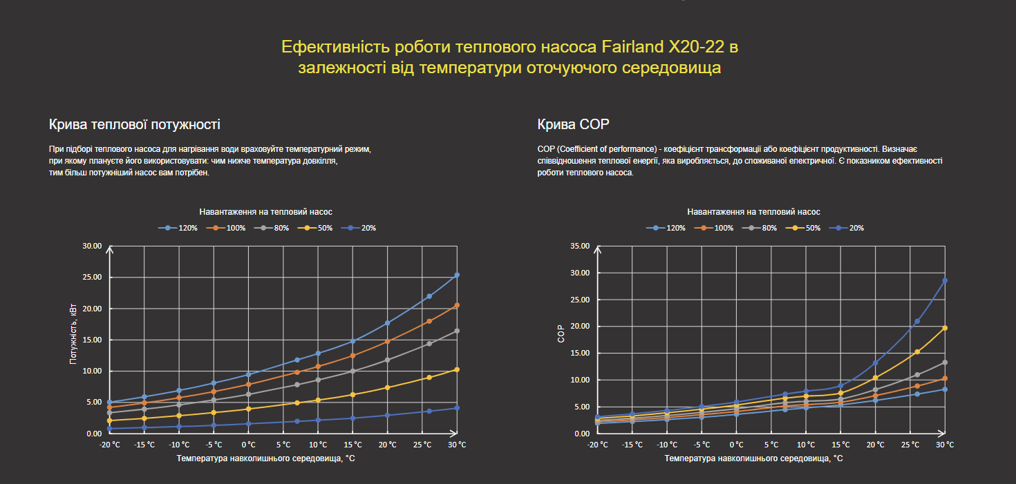 Режим Turbo: Теплопродуктивність: від 20% 120%. Цей режим призначений для швидкого нагріву води. Під час активації цього режиму насоси серії X20 виробляють додаткову енергію на 20%, забезпечуючи більш швидке нагрівання. При цьому насоси залишаються на рівні набагато тихішим, ніж звичайні інверторні насоси, і мають вищий коефіцієнт продуктивності (COP).