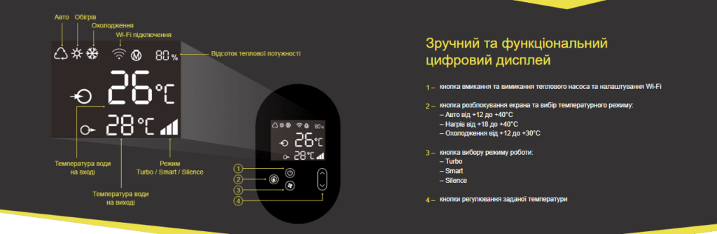 Контролер з РК-дисплеєм: забезпечує ефективну і зручну експлуатацію. Функція блокування екрана захищає налаштування насоса, забезпечуючи безпеку його роботи. Контролер відображає дані про потужність насоса і вентилятора, забезпечуючи можливість діагностики проблем. Таймер дає змогу контролювати часові параметри роботи насоса. Підтримка Wi-Fi дає змогу під’єднати насос до смартфона для повідомлень про проблеми. Контролер надає інформацію про поточний режим роботи насоса і його ефективність, що забезпечує точний контроль над процесом нагрівання або охолодження води в басейні.