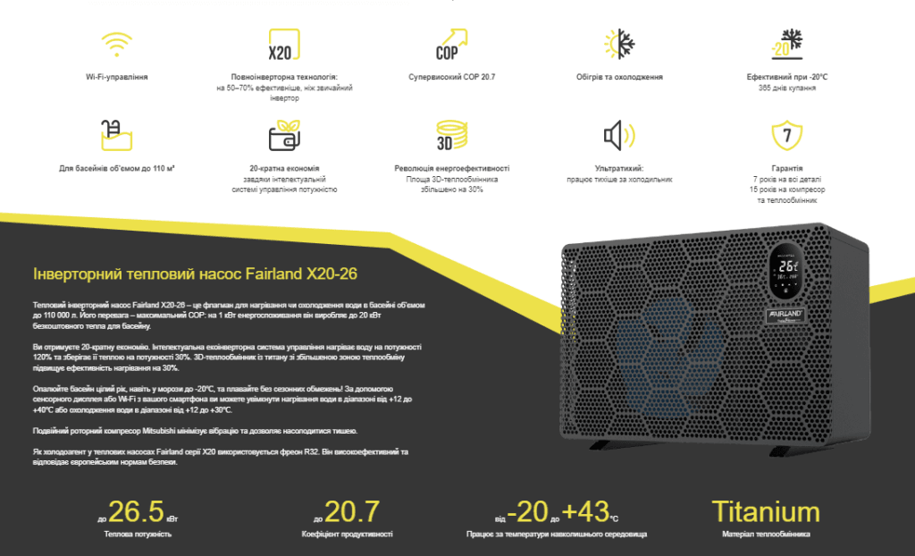 Fairland X20-26 — це тепловий інверторний насос, який встановлює нові стандарти в галузі нагрівання та охолодження води в басейнах. Він являє собою ідеальне рішення для басейнів об’ємом до 110 м³, забезпечуючи оптимальну температуру води в будь-який час року. Інверторна технологія та високоефективний компресор Mitsubishi  забезпечують високу ефективність на 50-70% вищу, ніж у стандартних інверторних системах. Завдяки вбудованій системі управління, насос легко налаштовується і контролюється в трьох різних режимах роботи: Turbo, Smart і Silence.