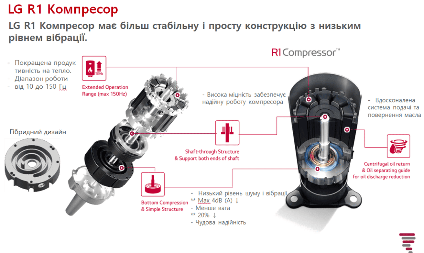 В основі теплового насоса LG Therma V лежить новий високотехнологічний та ефективний роторний компресор R1. Це перший у світі гібридний компресор, який об’єднав найкращі характеристики спіральних та роторних аналогів. Інноваційна технологія компресора підвищує надійність роботи, зводить до мінімуму втрати енергії та знижує рівень шуму.