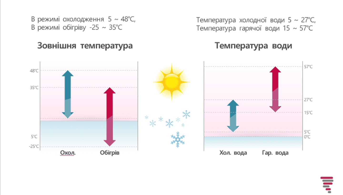 Тепловий насос LG Therma V забезпечує надійну та ефективну роботу навіть при екстремально низьких температурах до -25°C. Це робить його ідеальним вибором для регіонів із суворим кліматом. Завдяки технології Vapor Injection, заснованій на принципі двоступеневого стиснення, тепловий насос забезпечує ефективне опалення при дуже низьких зовнішніх температурах.