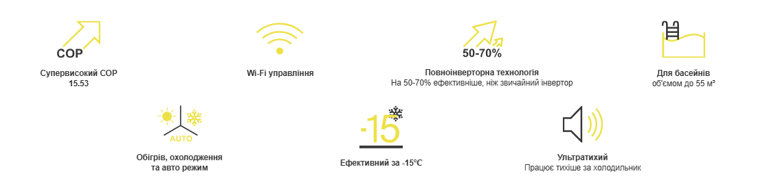 Працює з максимальним коефіцієнтом продуктивності: COP 15,53, що забезпечує ефективність та економію енергії під час обігріву або охолодження води у басейні.