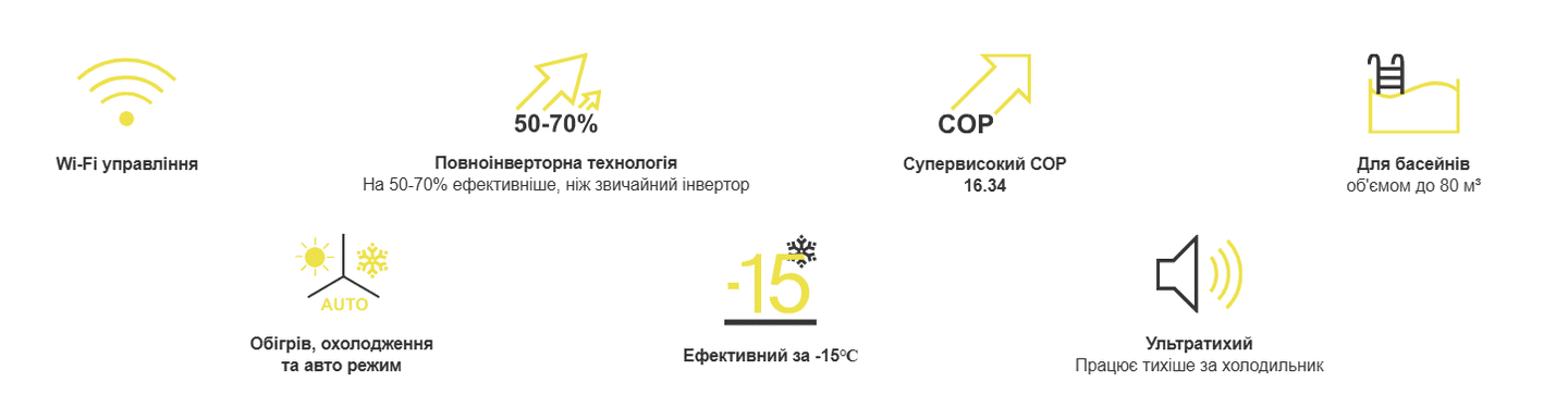 Працює з максимальним коефіцієнтом продуктивності: COP 16,34, що забезпечує ефективність та економію енергії під час обігріву або охолодження води у басейні.