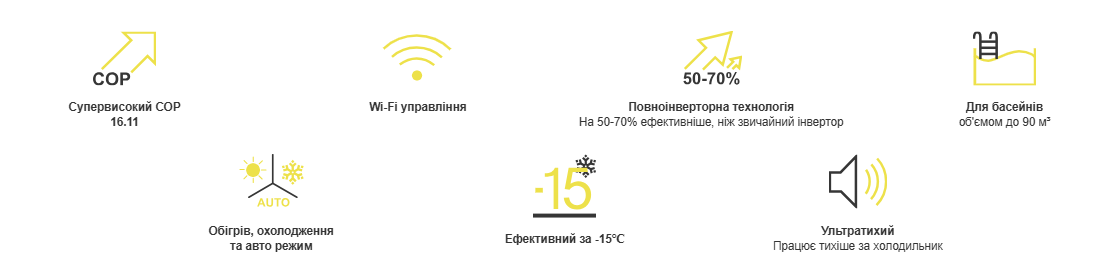 Працює з максимальним коефіцієнтом продуктивності: COP 16,11, що забезпечує ефективність та економію енергії під час обігріву або охолодження води у басейні.