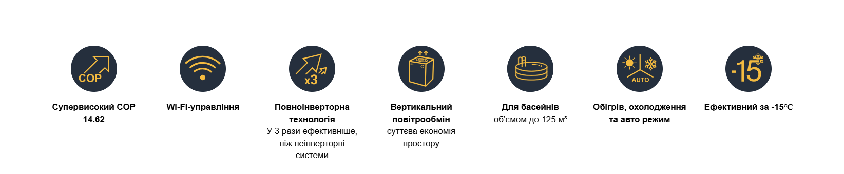 На зручному дисплеї відображаються всі параметри роботи – температура води, режим нагріву або охолодження, індикатори роботи компресора, вентилятора та таймера. Крім того, насос оснащений системою електробезпеки, захистом від перенапруги та функцією регулярної стерилізації, що запобігає розвитку бактерій у воді.