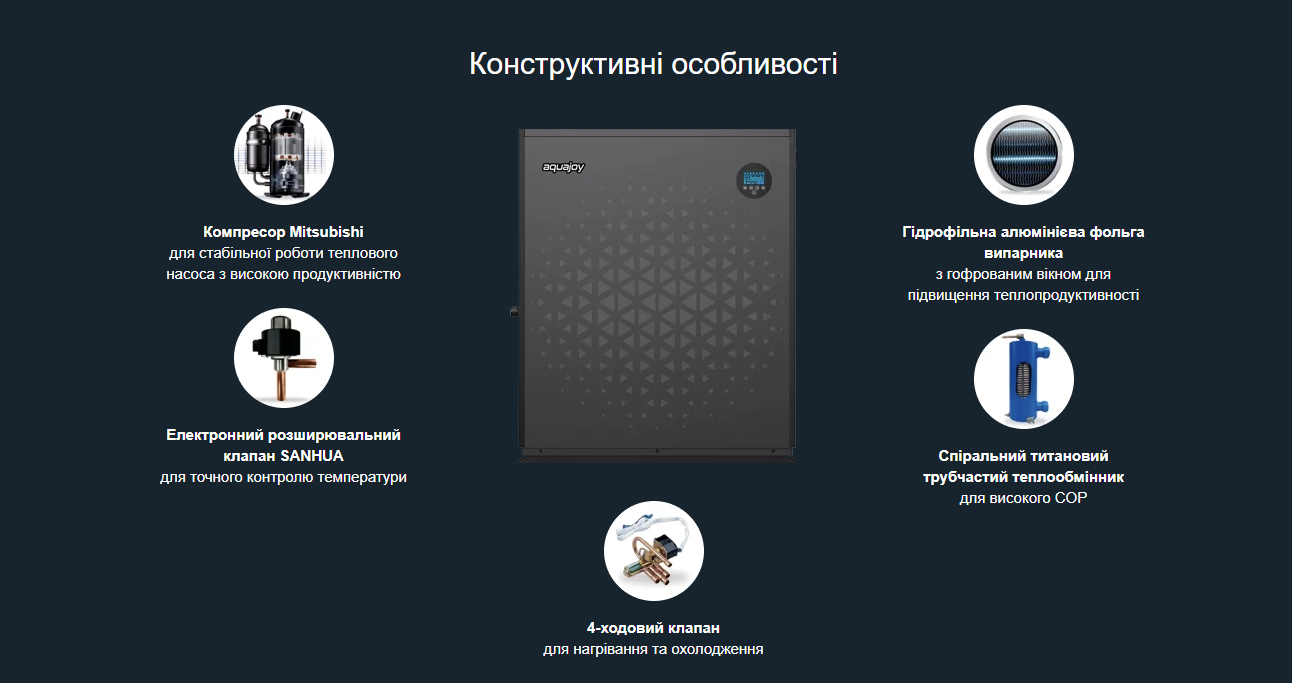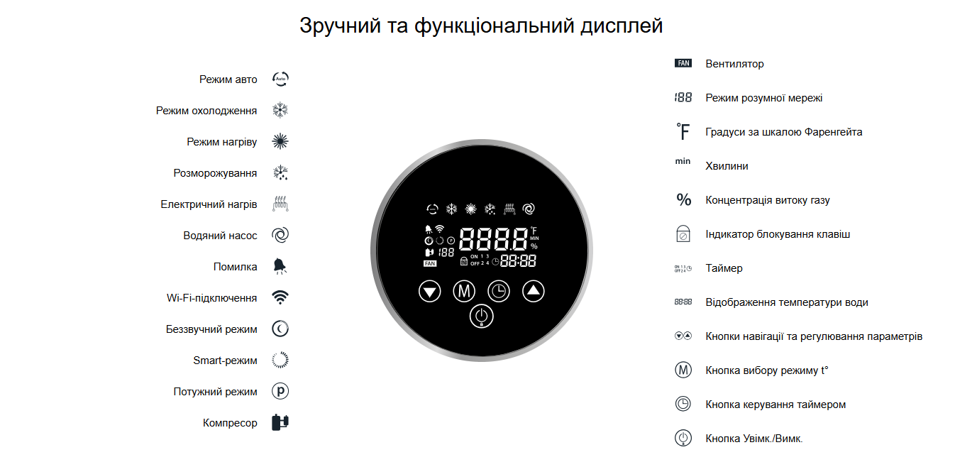 На зручному дисплеї відображаються всі параметри роботи – температура води, режим нагріву або охолодження, індикатори роботи компресора, вентилятора та таймера. Крім того, насос оснащений системою електробезпеки, захистом від перенапруги та функцією регулярної стерилізації, що запобігає розвитку бактерій у воді.