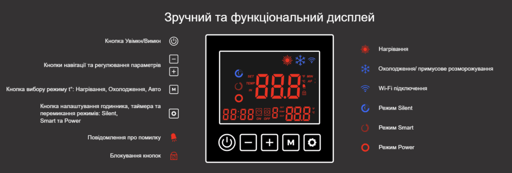 • Режим  роботи «Silent» теплового насоса полягає в спеціальному режимі, при якому насос працює з мінімальним рівнем шуму. У цьому режимі насос працює менш шумно, ніж у звичайному режимі, що особливо важливо в ситуаціях, коли потрібно мінімізувати шум, наприклад, вночі або в неподалік від житлових приміщень. Тихий режим забезпечує комфортне використання теплового насоса, не створюючи зайвого шуму, що особливо цінно в умовах житлових зон або офісних приміщень.