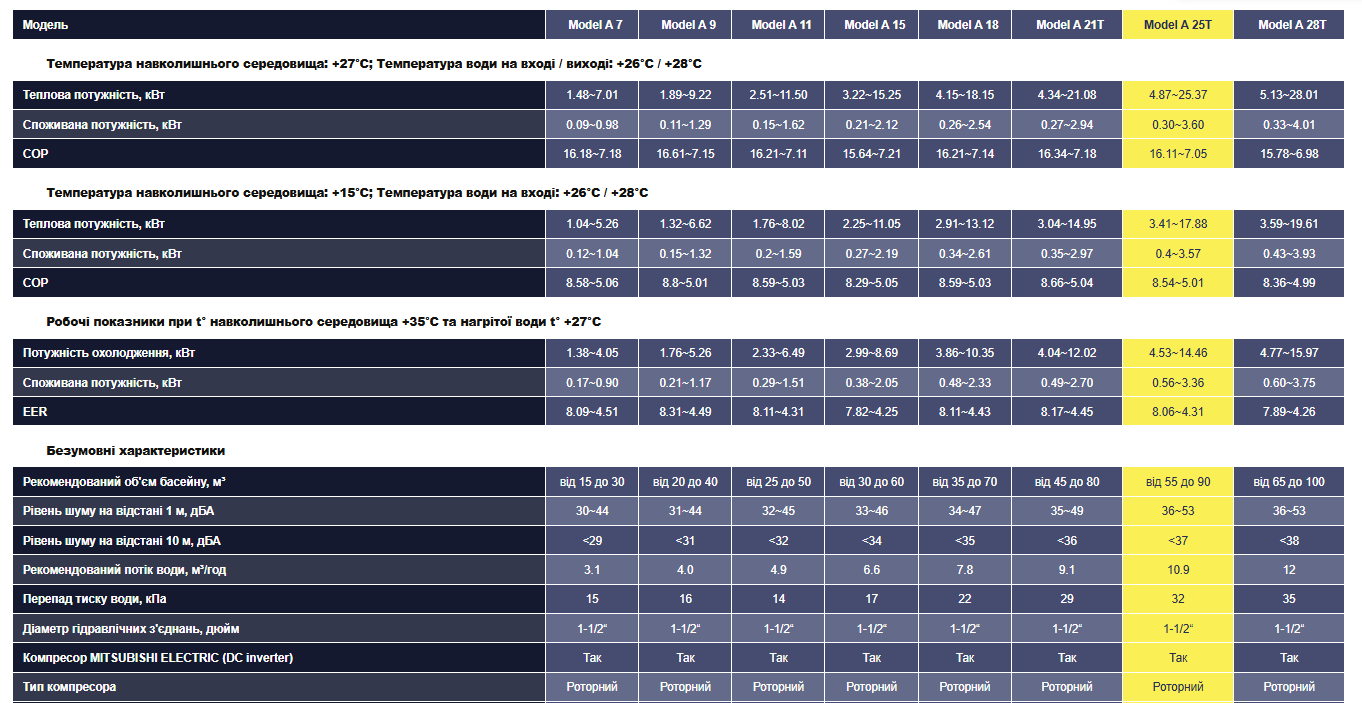 Тепловий насос Aquaviva Model A 25Т забезпечує високу ефективність за рахунок відсутності використання інверторної технології, але при цьому забезпечує максимальний коефіцієнт продуктивності. Він оснащений надійним компресором Mitsubishi Electric (DC Inverter), який працює стабільно в широкому діапазоні температур. Завдяки вбудованому контролеру, можна вибирати режими нагріву, охолодження або автоматичного підтримання бажаної температури води у басейні. Управління насосом доступне через Wi-Fi з вашого смартфона за допомогою додатка Smart Life, що забезпечує зручність та гнучкість управління у будь-який час та в будь-якому місці. Крім того, теплообмінник з титану гарантує надійну та довговічну роботу пристрою без корозії, а використання холодоагента R32 забезпечує високу ефективність і відповідність європейським стандартам безпеки.