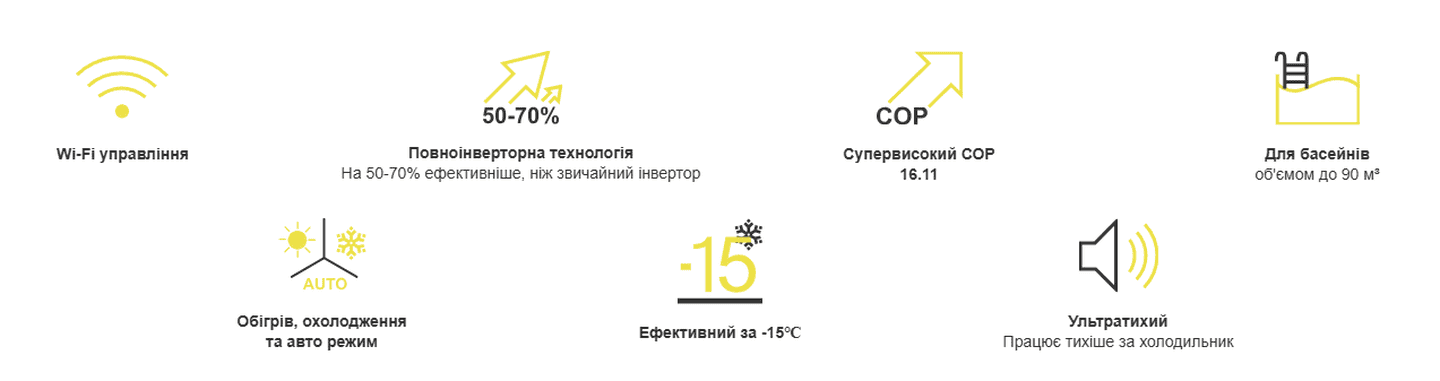 Працює з максимальним коефіцієнтом продуктивності: COP 16,11, що забезпечує ефективність та економію енергії під час обігріву або охолодження води у басейні.