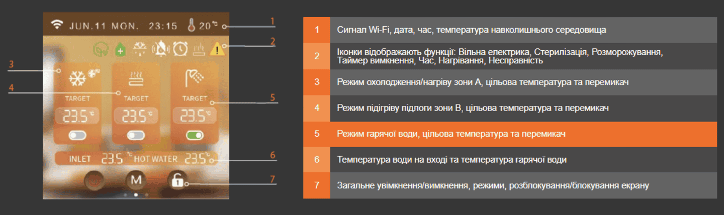 7. Автоматичний режим + гаряче водопостачання: Автоматично забезпечує опалення або охолодження та водночас надає гарячу воду.
