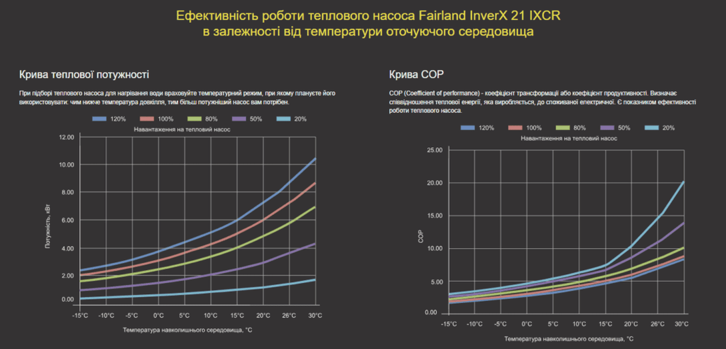 Режим Turbo: Теплопродуктивність: 120%. Цей режим призначений для швидкого нагріву води. Під час активації цього режиму насоси серії InverX виробляють додаткову енергію на 20%, забезпечуючи більш швидке нагрівання. При цьому насоси залишаються на рівні набагато тихішим, ніж звичайні інверторні насоси, і мають вищий коефіцієнт продуктивності (COP).