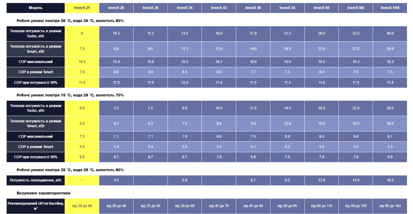 Режим Turbo: Теплопродуктивність: 120%. Цей режим призначений для швидкого нагріву води. Під час активації цього режиму насоси серії InverX виробляють додаткову енергію на 20%, забезпечуючи більш швидке нагрівання. При цьому насоси залишаються на рівні набагато тихішим, ніж звичайні інверторні насоси, і мають вищий коефіцієнт продуктивності (COP).