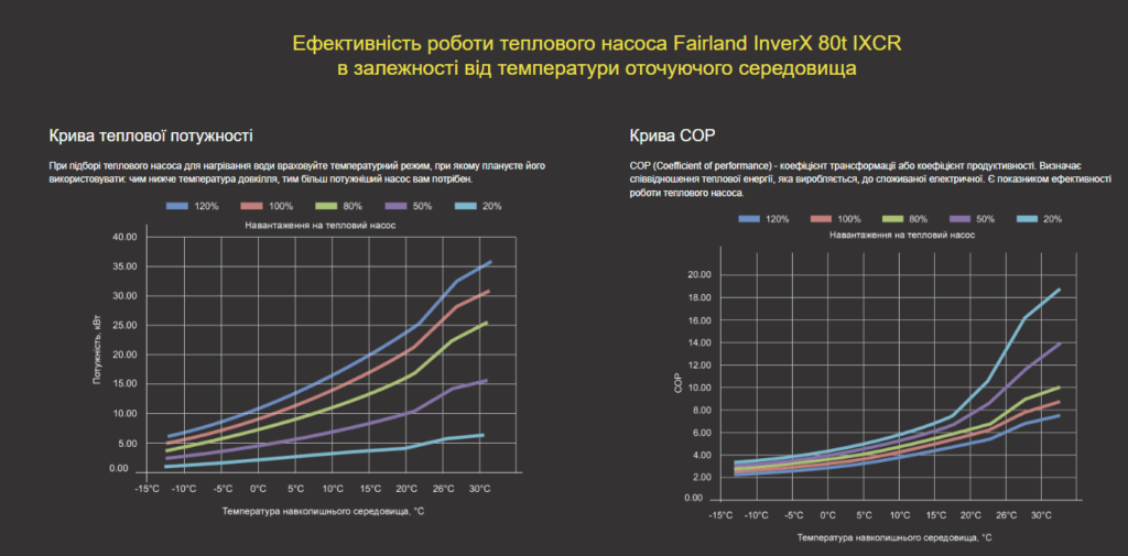 Режим Turbo: Теплопродуктивність: 120%. Цей режим призначений для швидкого нагріву води. Під час активації цього режиму насоси серії InverX виробляють додаткову енергію на 20%, забезпечуючи більш швидке нагрівання. При цьому насоси залишаються на рівні набагато тихішим, ніж звичайні інверторні насоси, і мають вищий коефіцієнт продуктивності (COP).