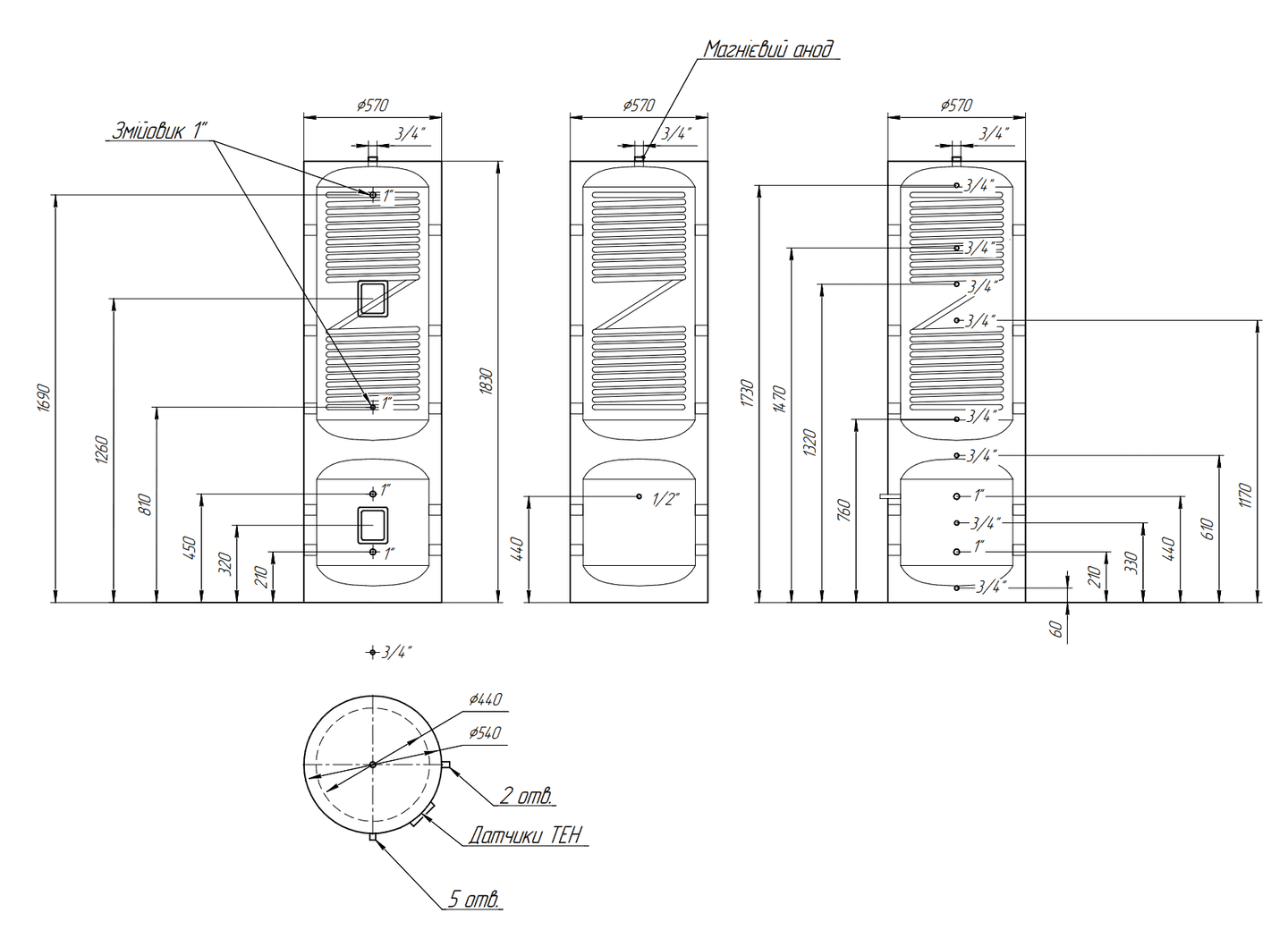 - Опціонально окремо можливе придбання Элеткро тэн к бакам (буферным емкостям),на 3 кВт, (вбудований) з регульованим термостатом.