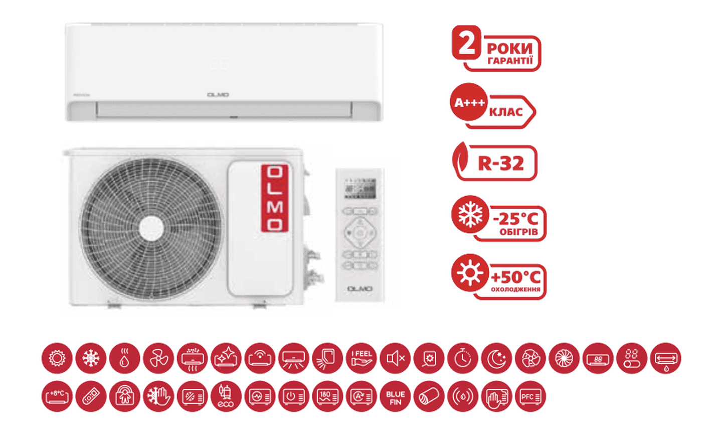 Wi-Fi Ready: За допомогою адаптера OL-WH, кондиціонер можна підключити до Wi-Fi, що дозволяє керувати всіма його функціями через мобільний додаток OLMO “SMART LIFE” KIT. Це забезпечує зручне віддалене управління та моніторинг роботи кондиціонера з будь-якої точки світу.