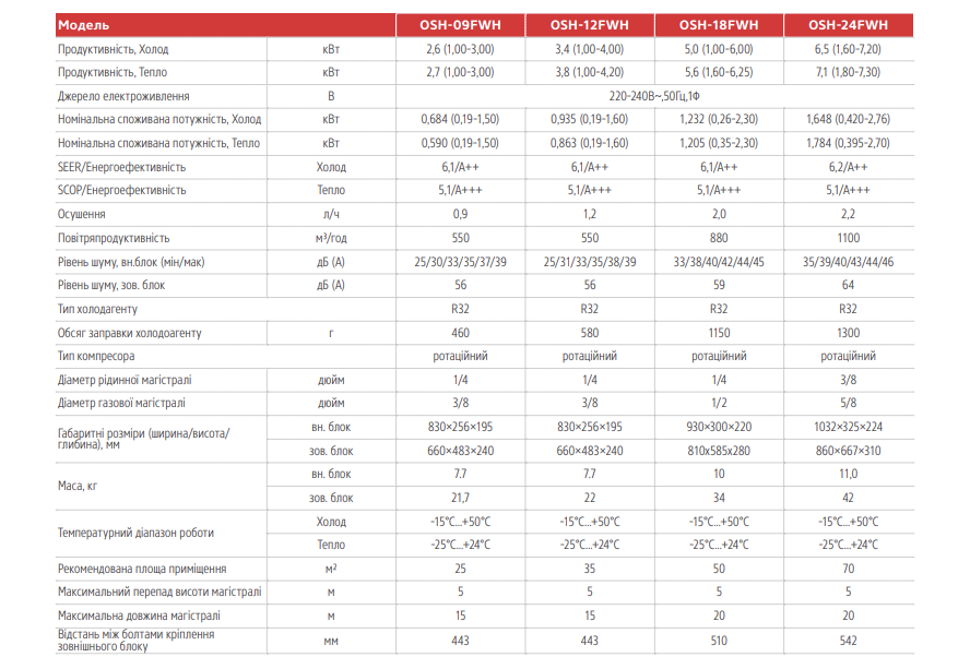 Режими роботи: Кондиціонер працює в режимах охолодження, обігріву, осушення та вентиляції з робочим діапазоном температур від -25 до 43 °C. Це дозволяє ефективно використовувати пристрій у будь-який сезон року.