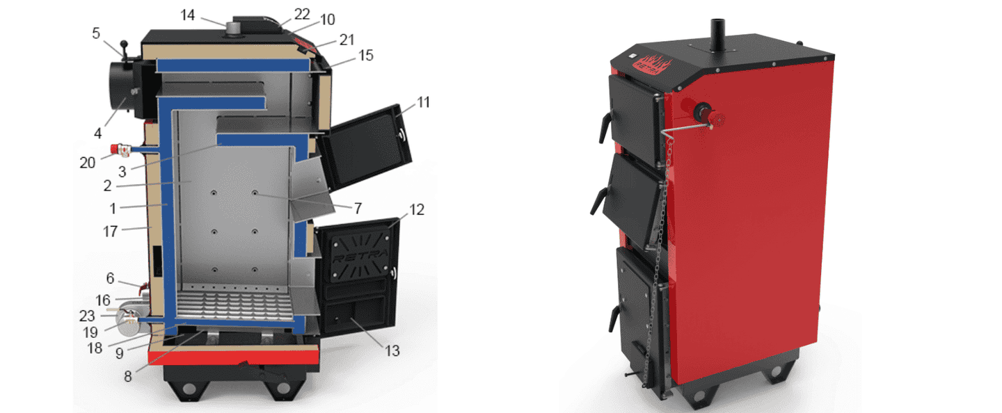 1. стальний теплообмінник; 2. камера згоряння (топка); 3. перегородка пряма; 4. димохід; 5. шибер газоходу поворотний; 6. шибер для регулювання вторинного повітря; 7. форсунки вторинного повітря; 8. розпушувача палива; 9. камера піддувала (зольник); 10. кожух декоративний; 11. люк завантажувальний; 12. люк вигрібний та видалення попелу; 13. люк піддувала; 14. патрубок подачі; 15. люк для чистки димових каналів; 16. патрубок звороту; 17. шар теплоізоляції; 18. решітка колосникова; 19. патрубок зливний з шаровим краном; 20. клапан запобіжний; 21. термометр; 22. пульт керування; 23. вентилятор надуву.