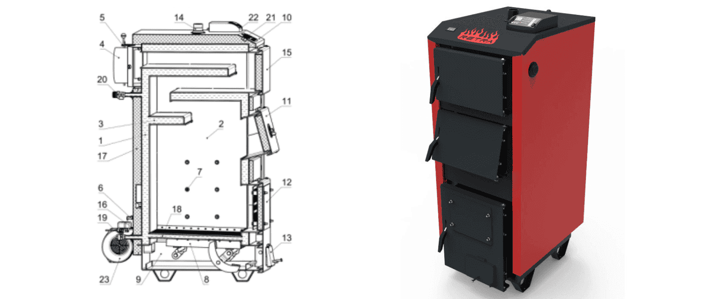 1. стальний теплообмінник; 2. камера згоряння (топка); 3. перегородка пряма; 4. димохід; 5. шибер газоходу поворотний; 6. шибер для регулювання вторинного повітря; 7. форсунки вторинного повітря; 8. розпушувача палива; 9. камера піддувала (зольник); 10. кожух декоративний; 11. люк завантажувальний; 12. люк вигрібний та видалення попелу; 13. люк піддувала; 14. патрубок подачі; 15. люк для чистки димових каналів; 16. патрубок звороту; 17. шар теплоізоляції; 18. решітка колосникова; 19. патрубок зливний з шаровим краном; 20. клапан запобіжний; 21. термометр; 22. пульт керування; 23. вентилятор надуву.