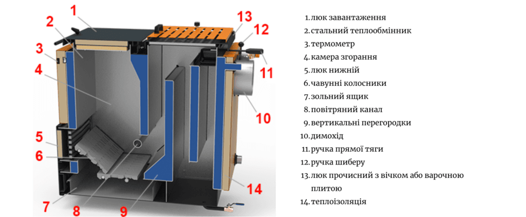 • Тип котла: шахтний твердопаливний водогрійний котел.