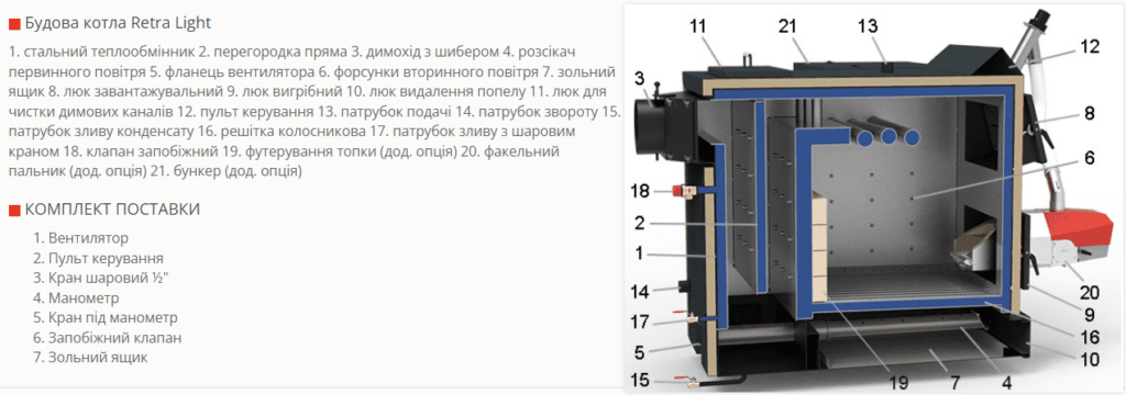 3. Котел Retra Light Combi 18 кВт твердопаливний до 180 м² площа обігріву побутовий з факельним пальником