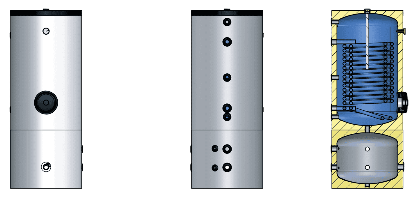 - Спрощення монтажу: Інтеграція буферної ємності та бака ГВП в один пристрій значно спрощує монтаж усієї системи, скорочуючи необхідну кількість підключень та полегшуючи інтеграцію з тепловим насосом.
