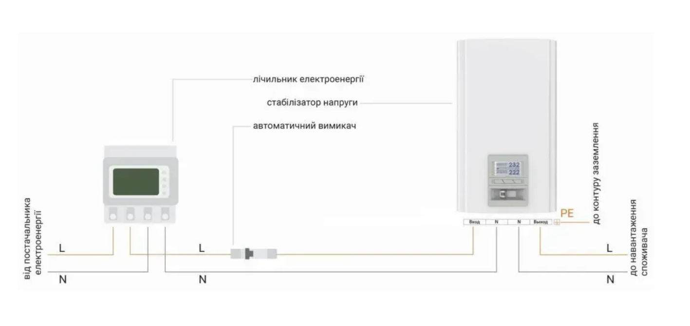Для підключення стабілізатора Ампер використовуйте існуючу проводку через клемну колодку. Це забезпечить надійне та безпечне з’єднання з електричною мережею.