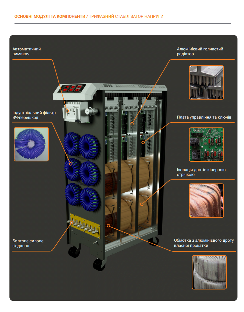 Стабілізатор спроектовано для незалежної стабілізації напруги в кожній із трьох фаз, забезпечуючи стабільне електричне живлення для трифазних пристроїв і обладнання.