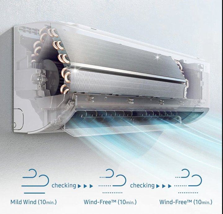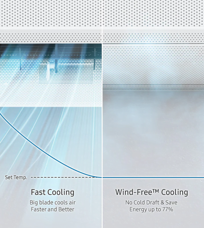 Samsung AE036TNXDEH/EU з Wind-Free™ охолодженням надає передові технології для забезпечення комфорту в домі, забезпечуючи ефективне охолодження, мінімальний рівень шуму і турботу про здоров’я та сон користувачів.