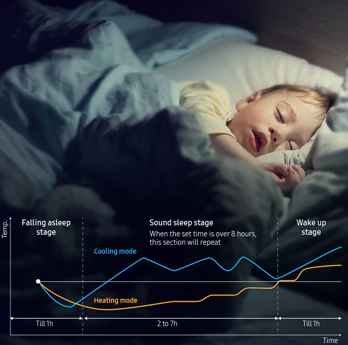 Режим “Хороший сон” дає змогу регулювати температуру з використанням функції охолодження Wind-Free. Це допомагає швидко засинати, забезпечуючи приємний і стабільний сон.