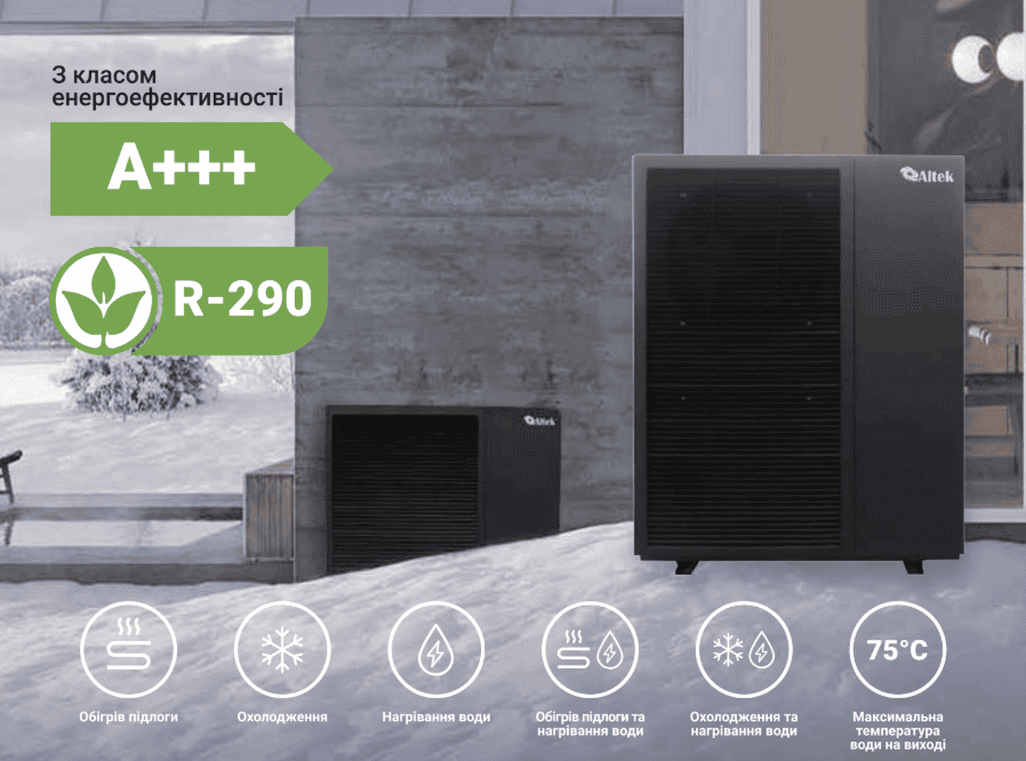 Теплова потужність Altek Total 12 mono при обігріві приміщення в 4,2 рази перевищує споживану електроенергію, що робить його найбільш ефективним рішенням для опалення, охолодження та ГВП вашого будинку.