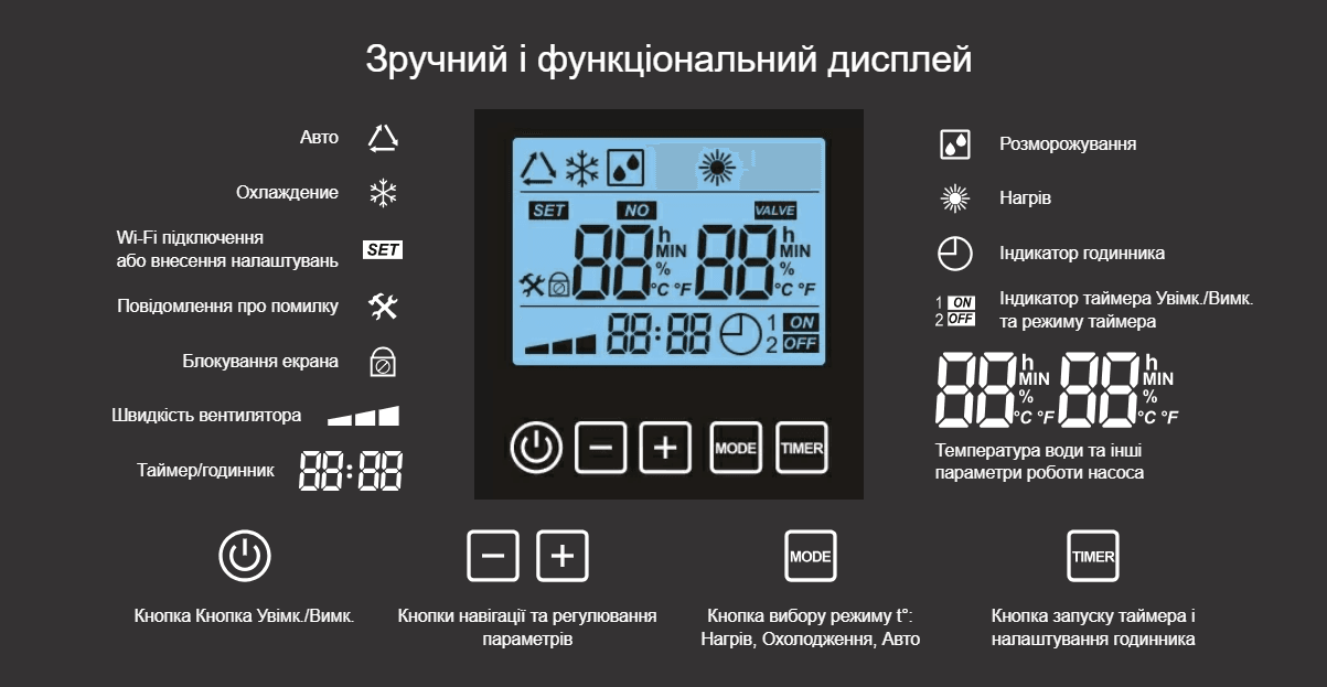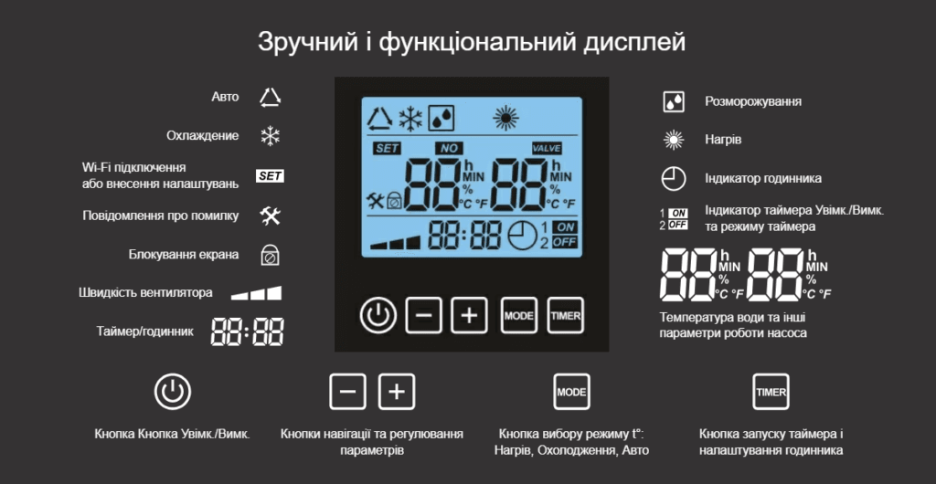 • Режим обігріву призначений для обігріву води у басейні в діапазоні від 15 до 40°C. Користувач може встановити бажану температуру, і тепловий насос буде працювати на максимальній потужності для швидкого досягнення цієї температури.