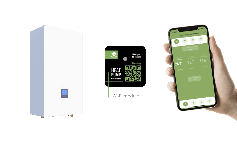 Дистанційне керування зі смартфона: додаток Mycond надає зручний інтерфейс для дистанційного керування тепловим насосом, зміни режимів, температур та отримання повідомлень про можливі помилки.