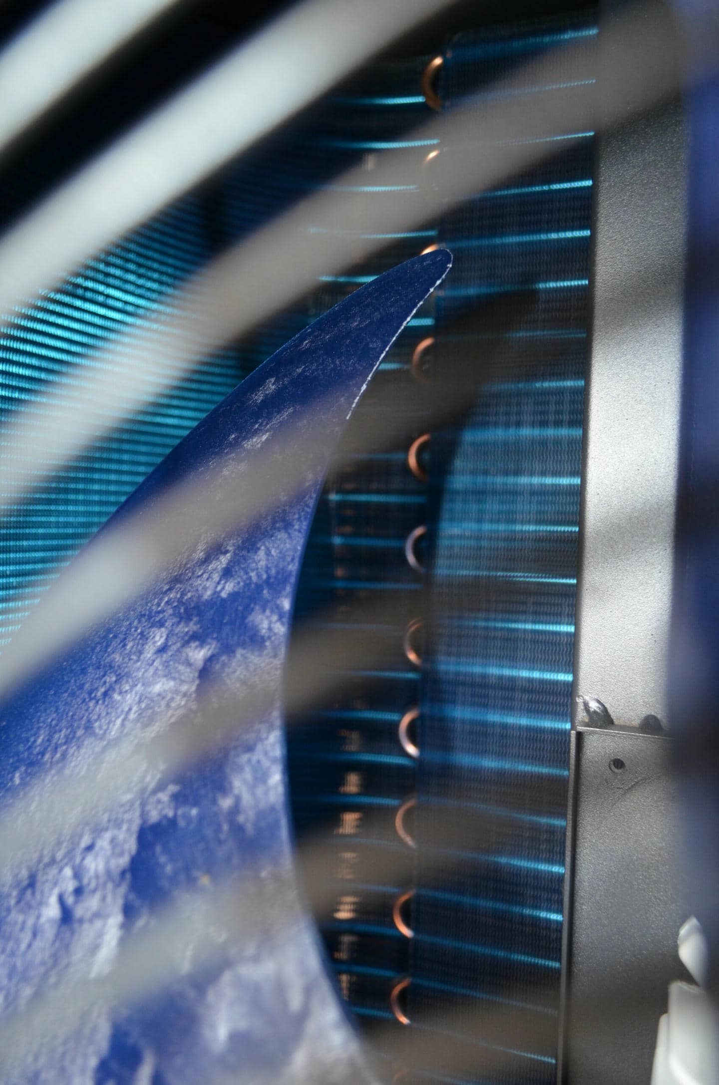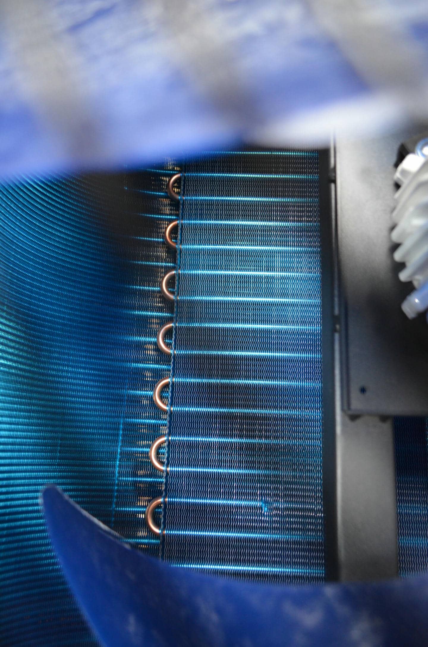 Гаряче повітря після передачі тепла повітрю назовні викидається через передні решітки вентиляторів.
