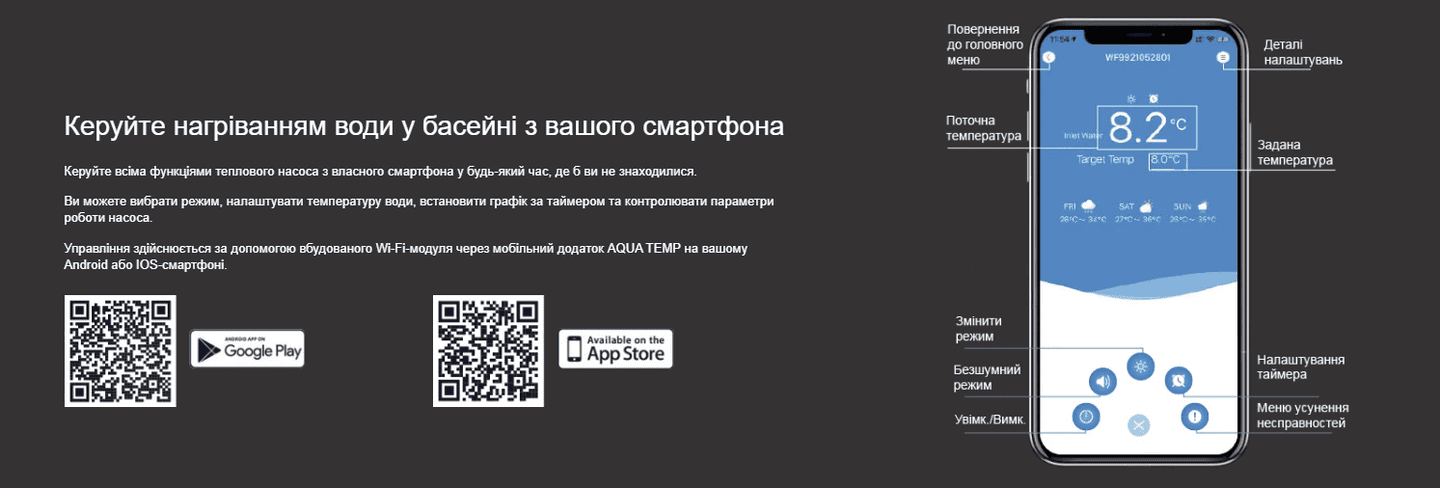 Завдяки вбудованому модулю Wi-Fi, користувач може керувати насосом прямо зі смартфона. Спеціальний додаток дозволяє запускати або зупиняти пристрій, змінювати температуру та контролювати параметри роботи віддалено — де б ви не знаходилися.