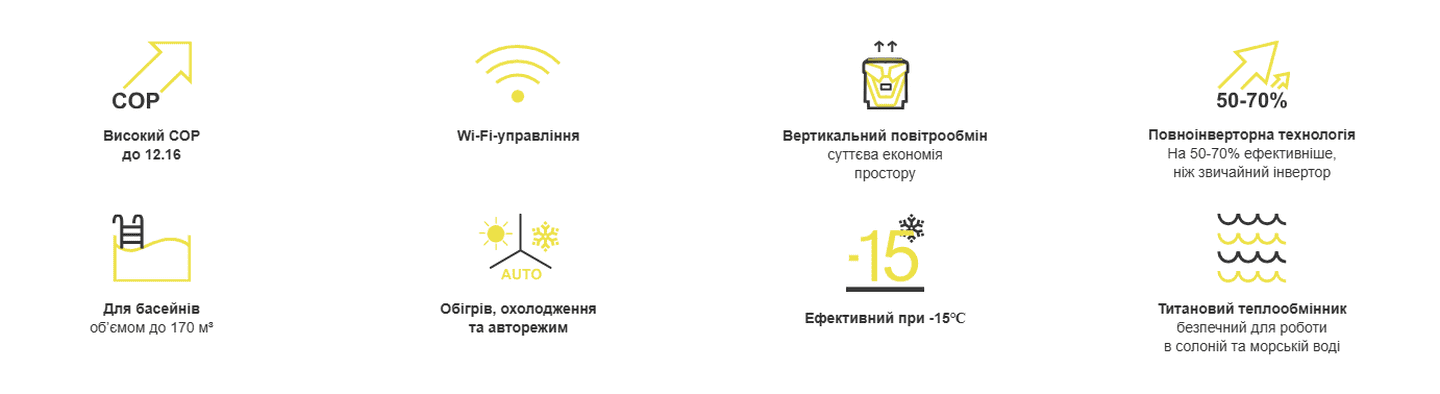 Технологія Full Inverter забезпечує адаптивну роботу компресора, вентилятора та електроніки, що дозволяє насосу працювати лише на необхідній потужності без перевитрати енергії. У середньому COP становить 12.16~5.23, що означає: на кожен кіловат спожитої електроенергії насос виробляє до 12 кВт теплової енергії. Це значно знижує експлуатаційні витрати та робить пристрій одним з найекономічніших у своєму класі.