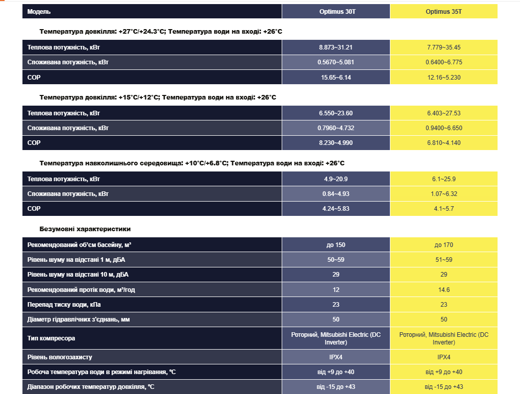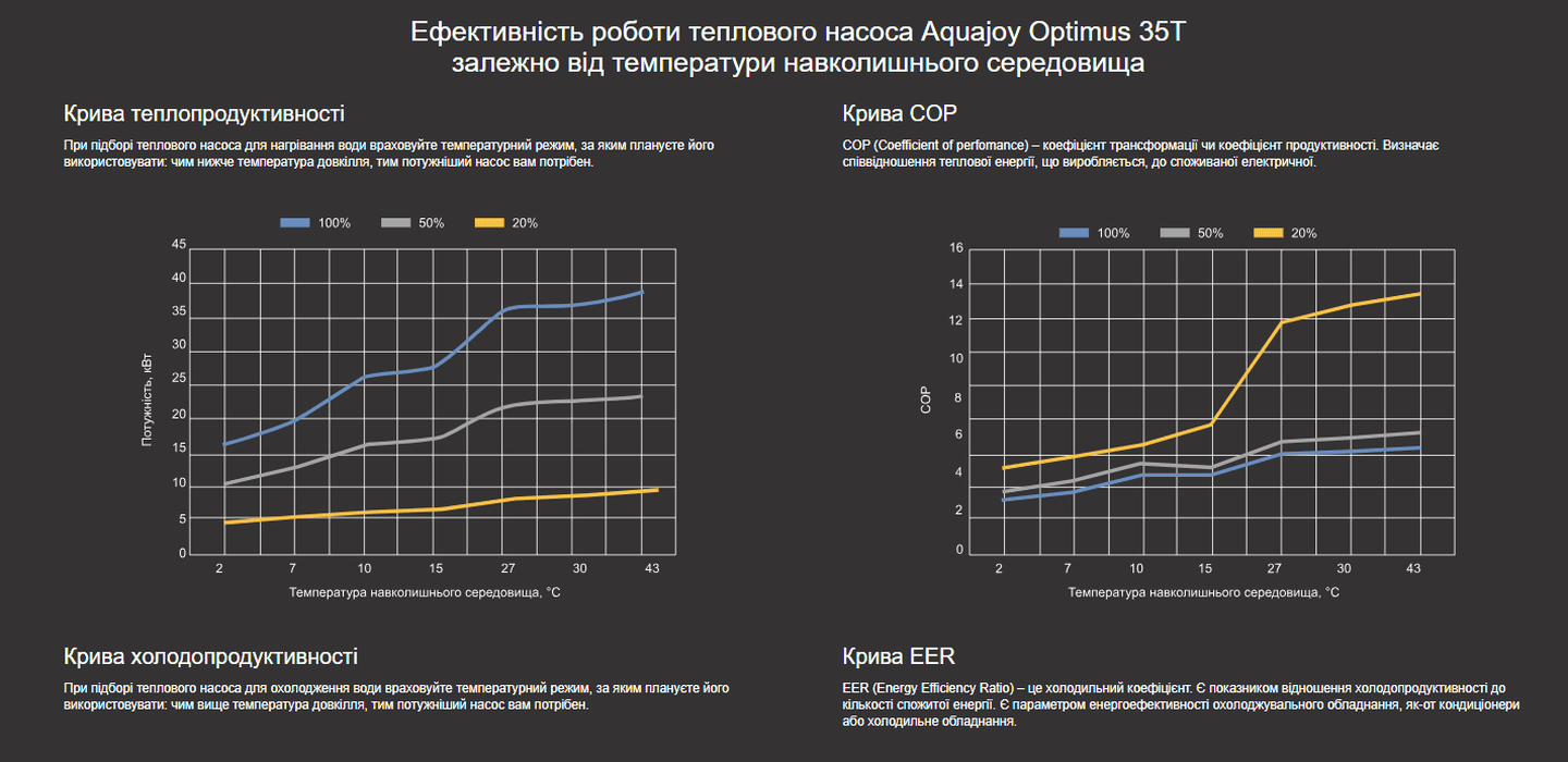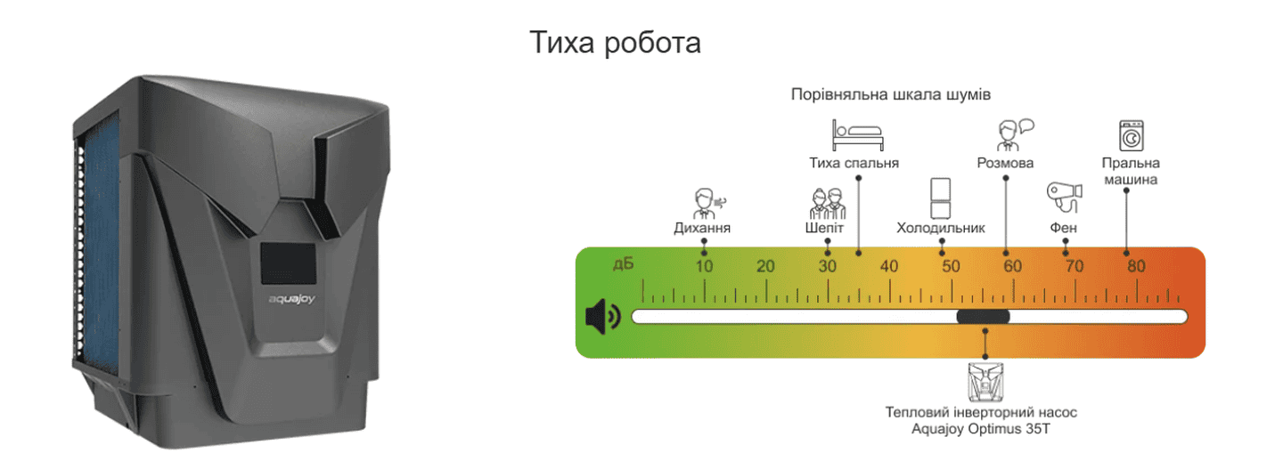 Aquajoy Optimus 35T — це потужне й інтелектуальне рішення для нагріву та охолодження води в басейнах об’ємом до 170 м³. Повний інверторний компресор у поєднанні з оптимізованим вентилятором забезпечує високий коефіцієнт продуктивності (COP) — у 1,5–2 рази вищий, ніж у стандартних моделей, зберігаючи при цьому до 12 кВт теплової потужності, що гарантує максимальну енергоефективність і помітну економію енергії.