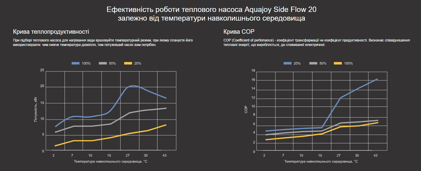 Максимальна теплова потужність пристрою становить 20 кВт, а коефіцієнт продуктивності (COP) сягає до 16,3 — це один із найвищих показників у своєму класі. Насос працює у діапазоні температур повітря від -10 до +43°C, забезпечуючи підігрів води від +9 до +40°C, а також охолодження в межах +8 до +28°C. Це робить Aquajoy Side Flow 20 придатним для використання цілий рік.