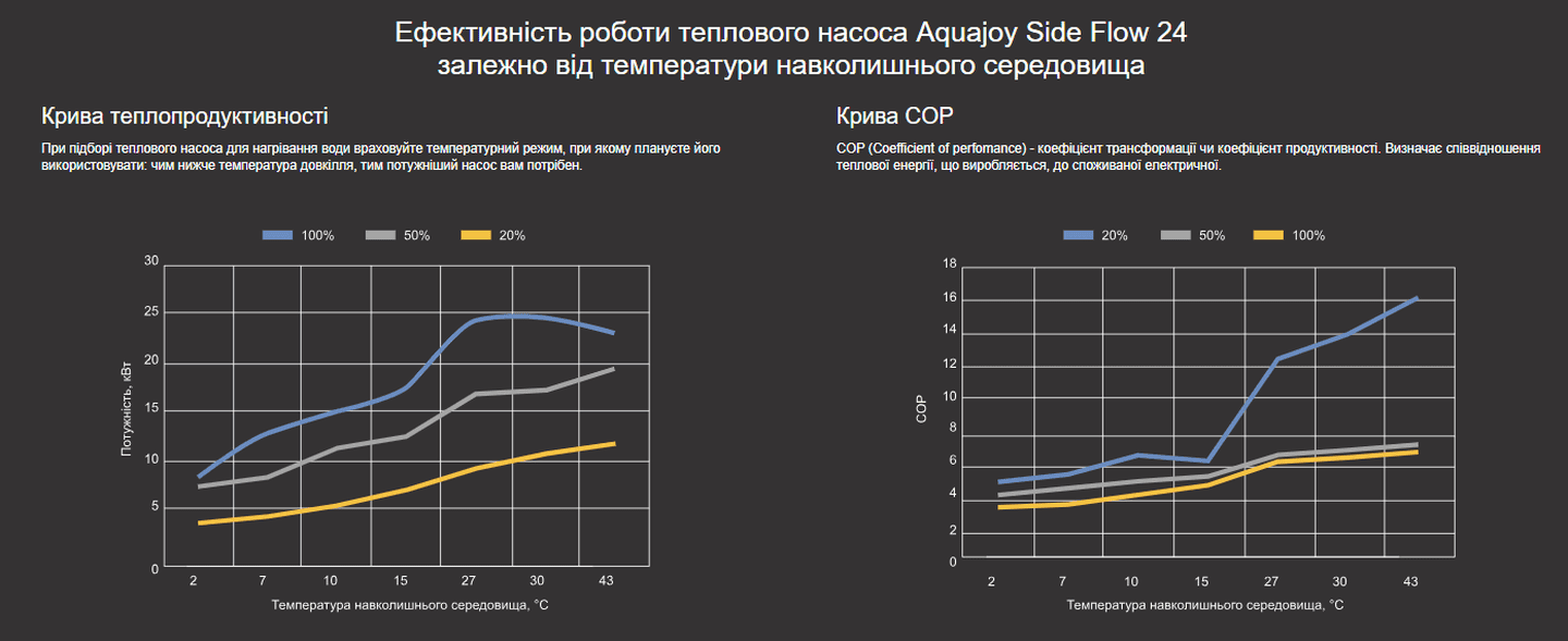 Максимальна теплова потужність пристрою становить 24 кВт, а коефіцієнт продуктивності (COP) сягає до 16,0 — це один із найвищих показників у своєму класі. Насос працює у діапазоні температур повітря від -10 до +43°C, забезпечуючи підігрів води від +9 до +40°C, а також охолодження в межах +8 до +28°C. Це робить Aquajoy Side Flow 24 придатним для використання цілий рік.