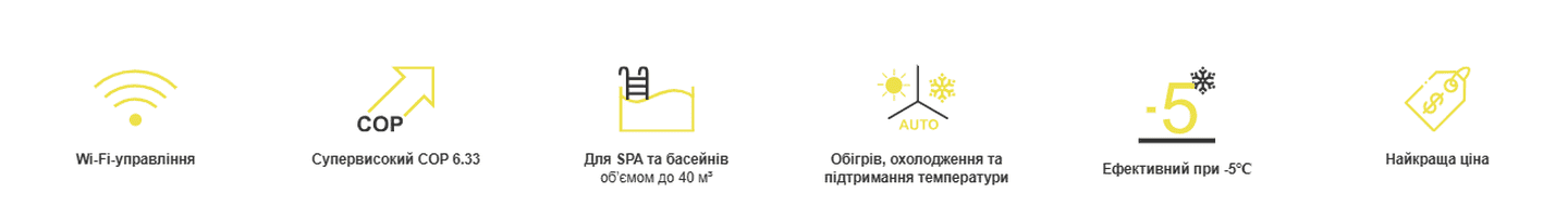 Працює з максимальним коефіцієнтом продуктивності: COP 6,33, що забезпечує ефективність та економію енергії під час обігріву або охолодження води у басейні.